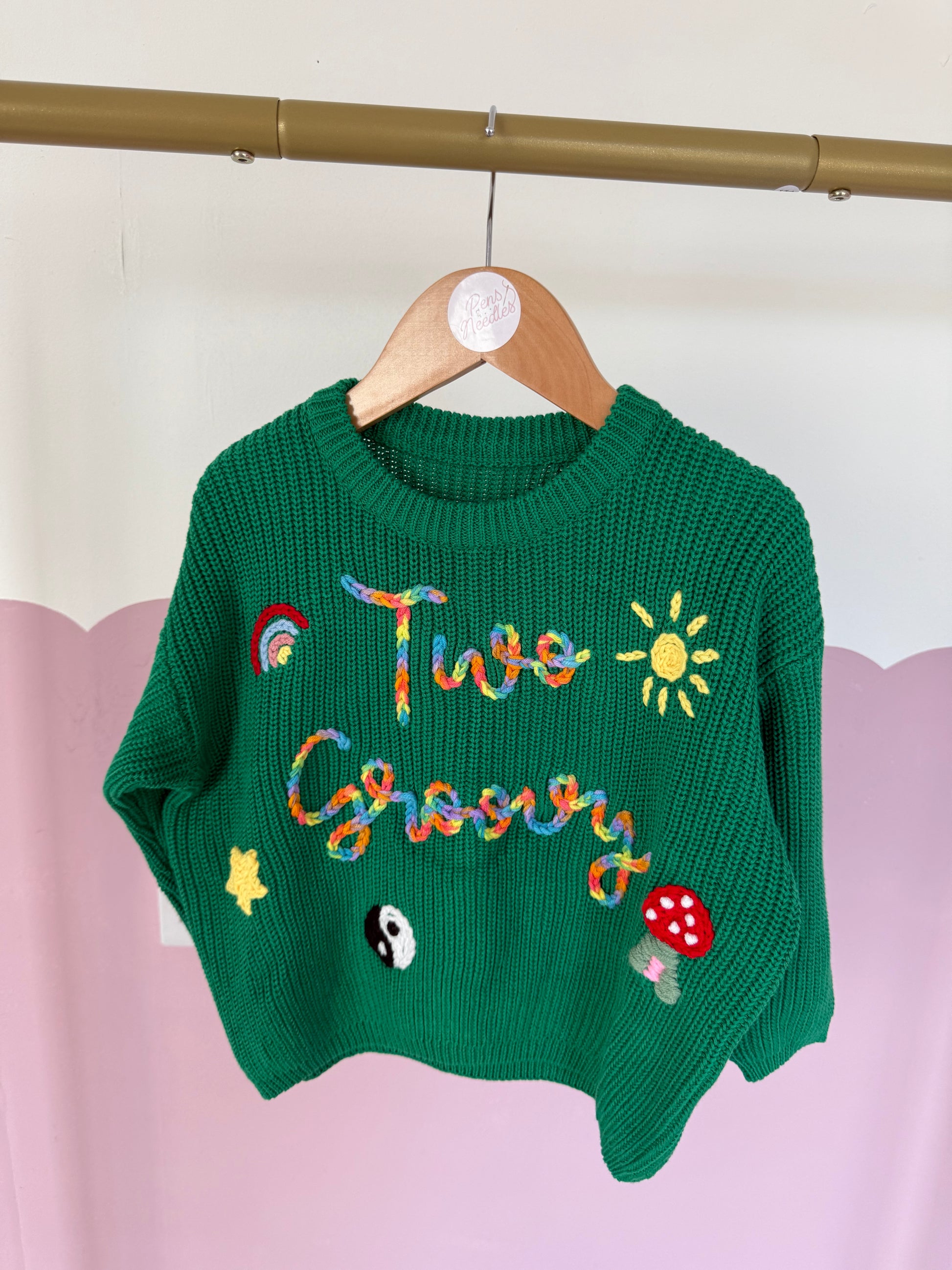 Pre order listing for the Two Groovy jumper - this one was originally made for my son’s second birthday. On a brand new colour of jumper, Christmas Green, this one is perfect for those who love dopamine dressing 🌈